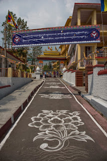 It was like a very big church picnic in the Gupta Buddhist Monastery Temple for the visit and teaching by the Dalai Llama. A sea of maroon robes with flashes of yellow. The temple was dedicated with thousands of flags, a humid hot day in India. Everyone arrived hours early, excited for the event, the monks, the visitors, the Tibetans. On the way up the walk way, painted with mandalas, the Thanka master artist from Norbulingka recognized me and took my hand, holding it while he talked, very excited, it seemed to see me there.
